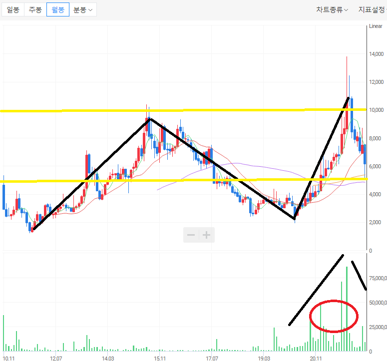 ㄴ) 월봉 차트에서 상승하면 꾸준하게 상승 추세가 형성되며, 하락해도 꾸준하게 하락 추세가 형성된다. 지금은 하락을 마무리하는 추세 구간으로 보인다.
