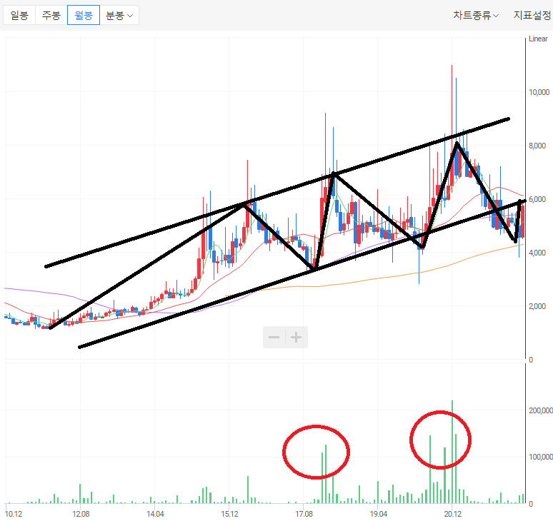 ㄴ) 월봉 차트에서 상승 채널을 형성하며 상승 중이지만 최근에 하단을 깊게 누르고 탄력 있게 상승하고 있다. 아직까지는 대량의 거래량이 나타나지 않는 것으로 보아서 상승할 수 있는 가능성이 높다고 본다.