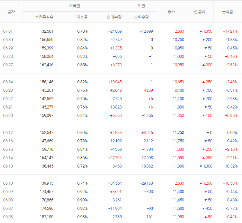 ㄴ) 7월 1일 수급은 개인 4.5억 매수, 외국인 3.0억 매도, 기관 1.6억 매도하였다.