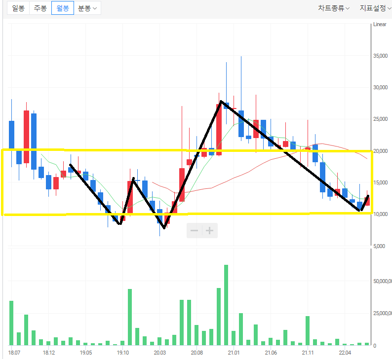 ㄴ) 월봉 차트에서 상장 이후 약 1만 원 ~ 2.5만 원에서 박스권 형태로 주가가 진행되고 있다. 약 1만 원 부근에서는 지지가 되고 있다.