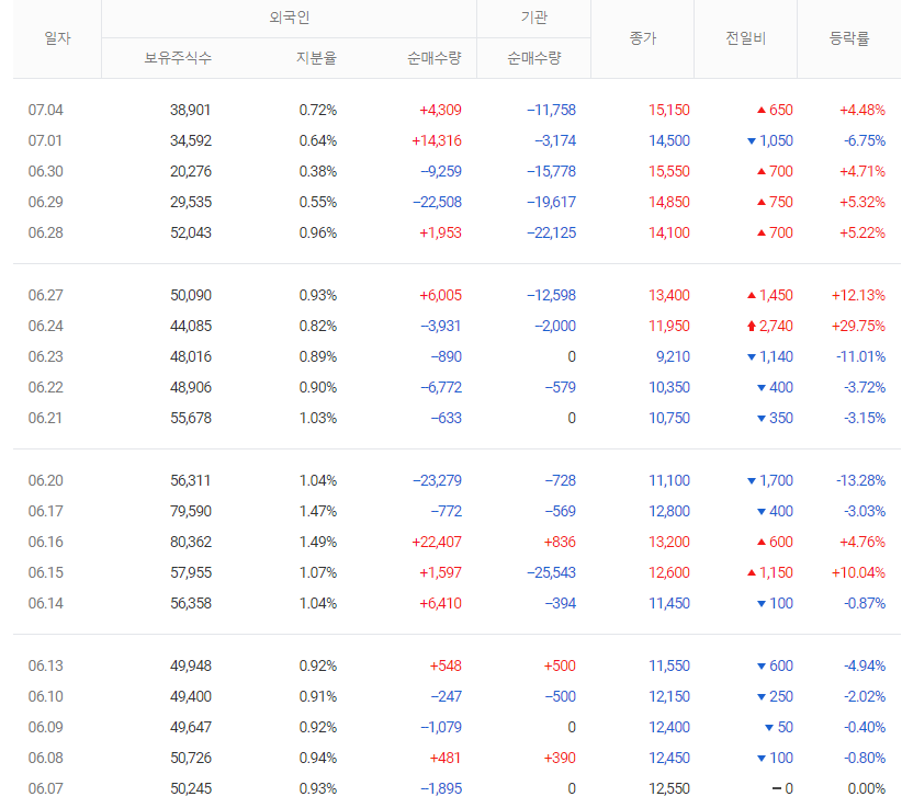 ㄴ) 7월 5일 수급은 개인 93.8억 매수, 외국인 3.1억 매수, 기관 33.4억 매도하였다. 기타 법인 72.0억 매도하였다.