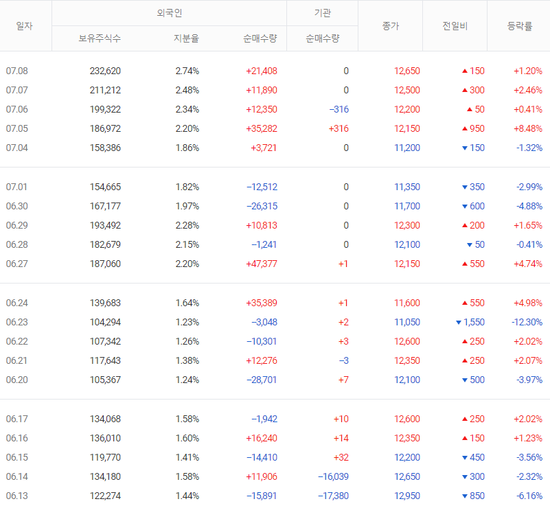 ㄴ) 7월 11일 수급은 개인 13.0억 매수, 외국인 13.2억 매도하였다.