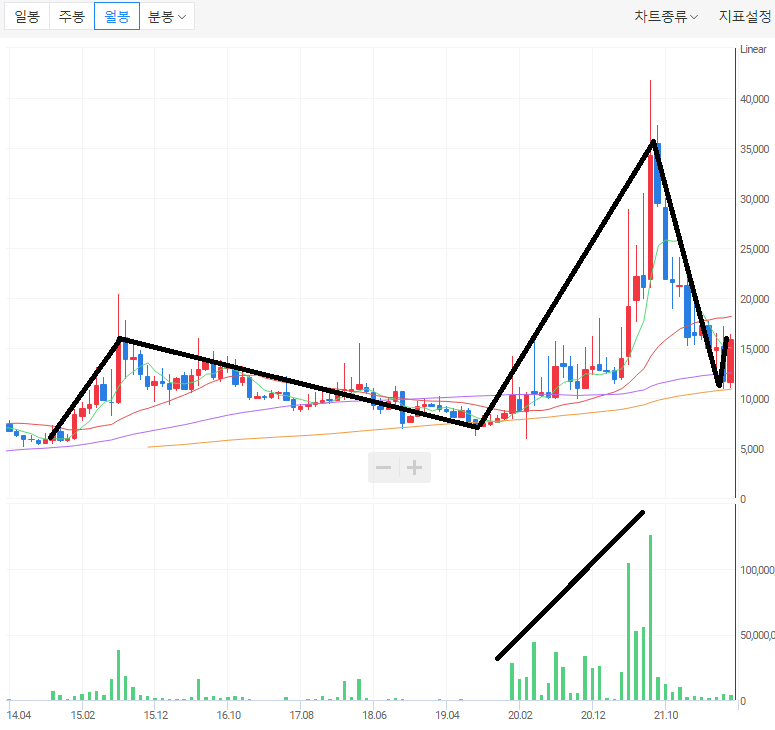 ㄴ) 월봉 차트에서 코로나19로 인하여 대세 상승한 급등은 급락으로 이어졌고 지금은 크게 하락분에 대한 반등으로 보인다.