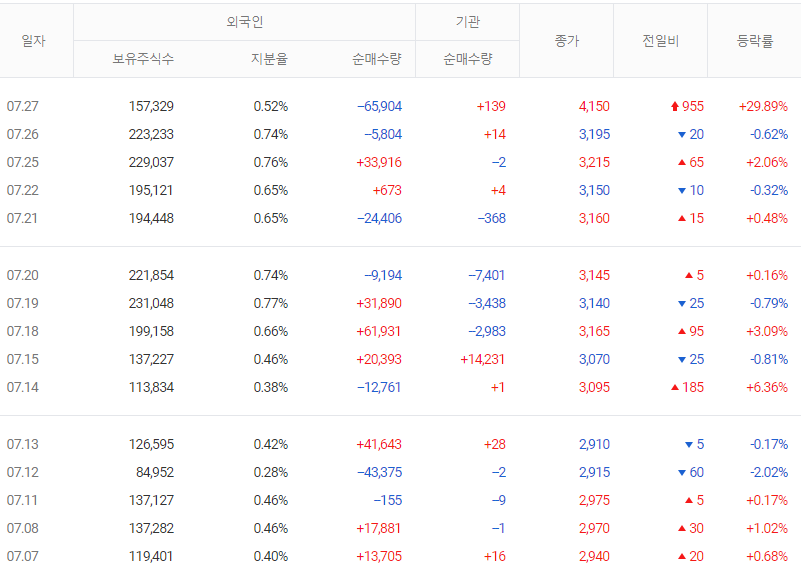 ㄴ) 7월 27일 수급은 개인 6.2억 매수, 외국인 2.3억 매도, 기관 0.01억 매수하였다. 기타 법인이 3.2억 매도한 것이 특징이다.