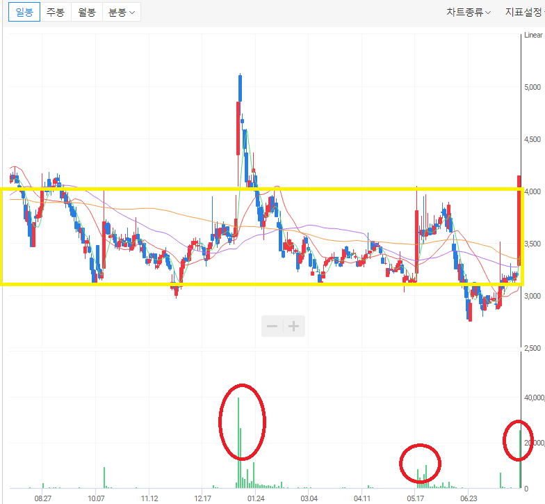 ㄱ) 일봉 차트에서 대량의 거래량으로 박스권 돌파를 시도하고 있다.