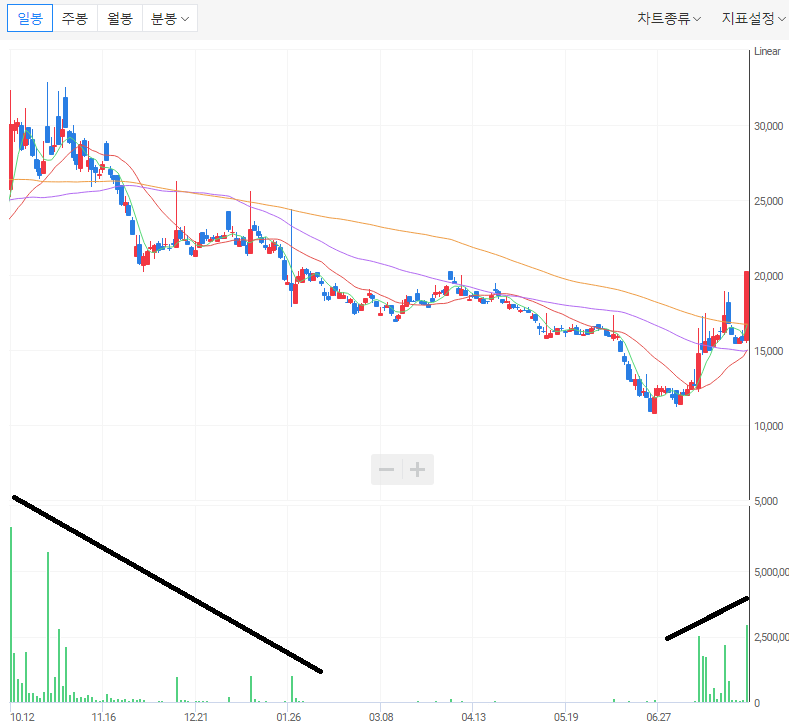 ㄴ) 월봉 차트에서 상장하고 대세 상승 이후에 조정을 보이다가 다시 상승하는 분위기이다. 상승할수록 매물대가 많이 있기 때문에 가파른 상승은 힘들어 보인다.