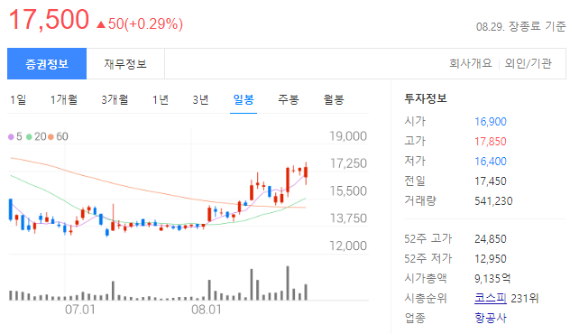 - 항공 항공운송산업에 속한 회사이며, 현재 항공기를 이용한 운송 서비스를 주요 상품으로 하여 소비자에게 판매 중이다.