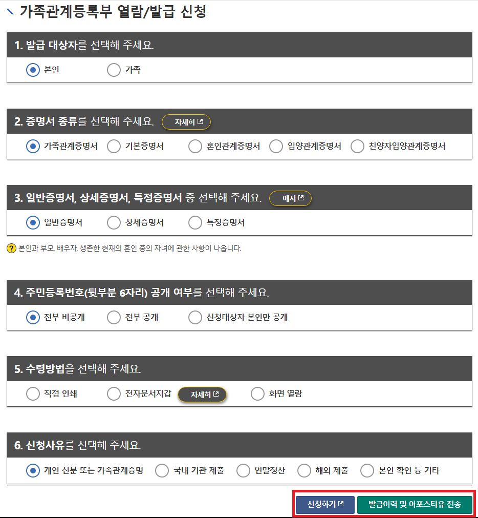 5. 가족관계 등록부에서 본인이 필요한 사항들에 대해서 체크를 한후에 신청하기 버튼을 클릭한다.