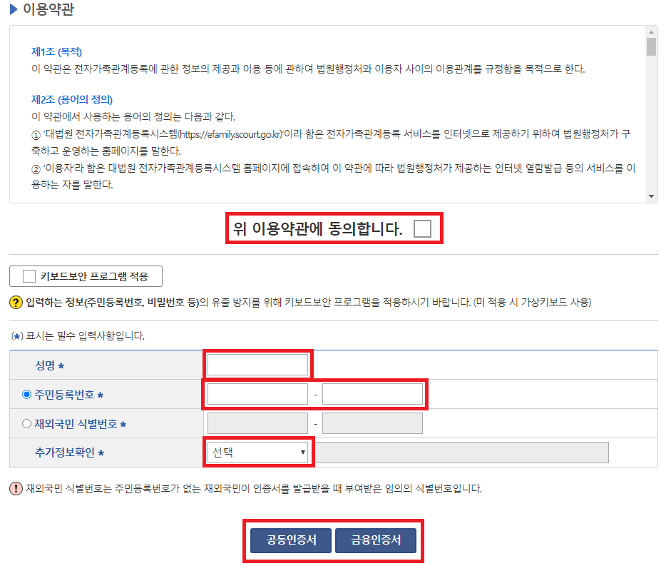 3. 이용약관 동의에 체크하고 성명, 주민등록번호, 추가정보확인을 클릭한 후에 공인인증서나 금융인증서 중에 본인에게 사용이 편리한 것을 클릭한다.