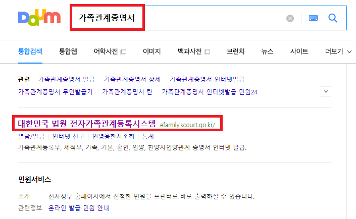 1. 다음에서 가족관계 증명서를 검색한후에 대한민국 법원 전자가족관계등록시스템을 클릭한다.