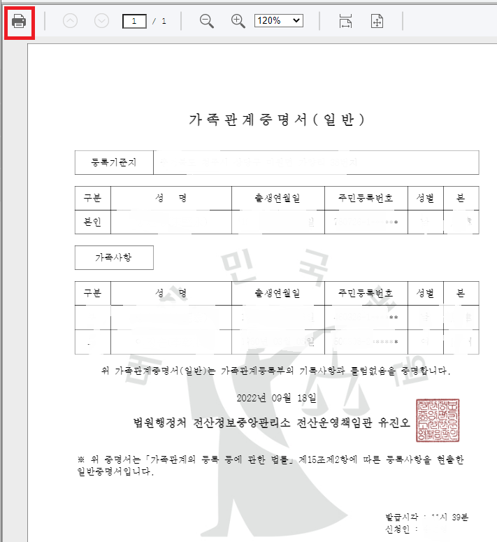 6. 가족관계 증명서가 발행되면 좌측 상단에 프린트를 클릭하면 프린트 할 수 있다.