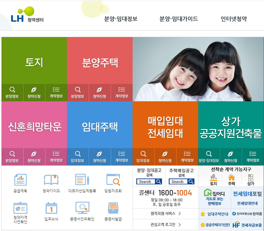 LH청약센터는 토지, 분양주택, 상가, 임대주택, 신혼 희망타운, 전세 임대에 대한 공급을 알 확인할 수 있다.
