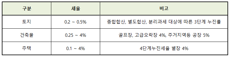 ㄴ) 토지, 건축물, 주택은 세율이 다르게 적용되며, 골프장과 오락장 공장, 별장 등은 세율이 높게 적용된다.