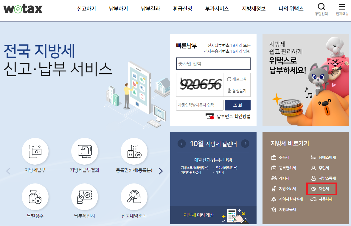 위텍스 홈페이지에 접속하여 우측 하단에 재산세 클릭하여 납부할 수 있다.