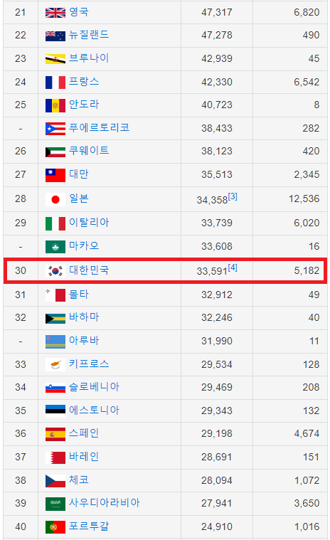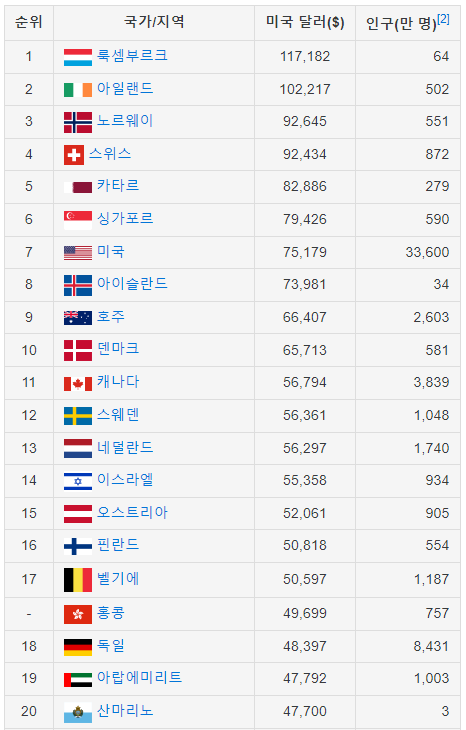 국가별 1인당 GDP 순위 TOP40을 알아보자.