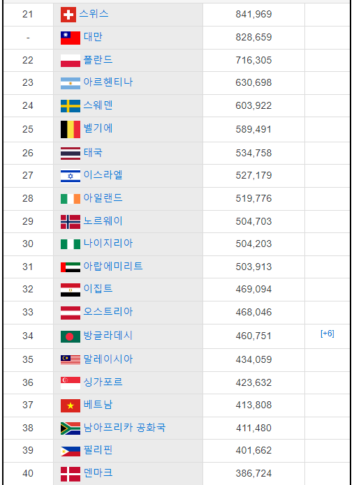 2022년 월드컵을 개최한 카타르가 5위에 해당되며, 중국은 인구가 많아서 65위에 위치해 있다.