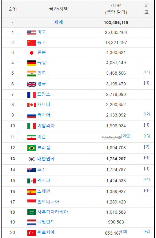 역시 미국과 중국이 세계의 공장이라고 불릴 만큼 GDP 순위 1, 2위이다.