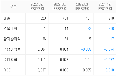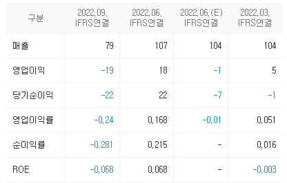 - 제품 및 용역 매출은 증가했으나 상품 매출 감소로 외형이 축소되었고, 판관비 등 고정비 증가에 의해 영업손실과 순손실이 지속되고 있다.