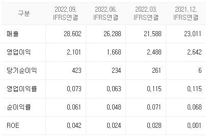 - 동사 매출은 전년 동기 대비 증가했으나 매출원가와 판관비의 증가폭이 더 커서 영업이익이 소폭 감소하였다.