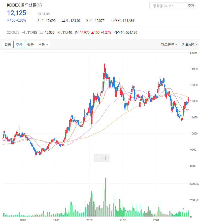 KODEX 골드선물(H)과 KODEX 골드선물인버스(H) 두 가지로 골드 상승과 하락 방향으로 투자가 가능하다.