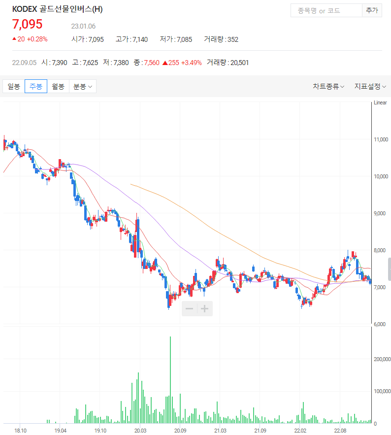 KODEX 골드선물(H)과 KODEX 골드선물인버스(H) 두 가지로 골드 상승과 하락 방향으로 투자가 가능하다.