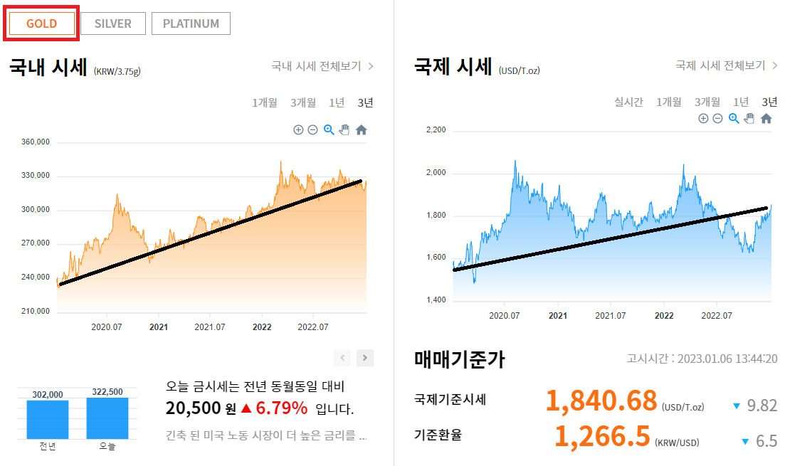 국내 금 시세는 지난 3년 동안 꾸준히 상승하여 지금은 고점에서 머물고 있으며, 국제 시세는 1,600 ~ 2,000원의 박스권 시세를 보이고 있다.