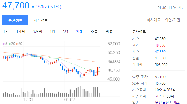 - 실적 개선을 위해 5G 통신망 구축을 주도하고 빅데이터, AI를 접목한 서비스를 선보이는 등 다방면으로 노력 중이다.