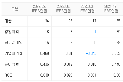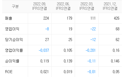 - 비교적 높은 매출액 성장을 보였으나 원가율 상승이 가팔랐고, 판관비 등 비용 증가로 영업손실을 보였으나 순손익은 흑자기조를 유지하고 있다.