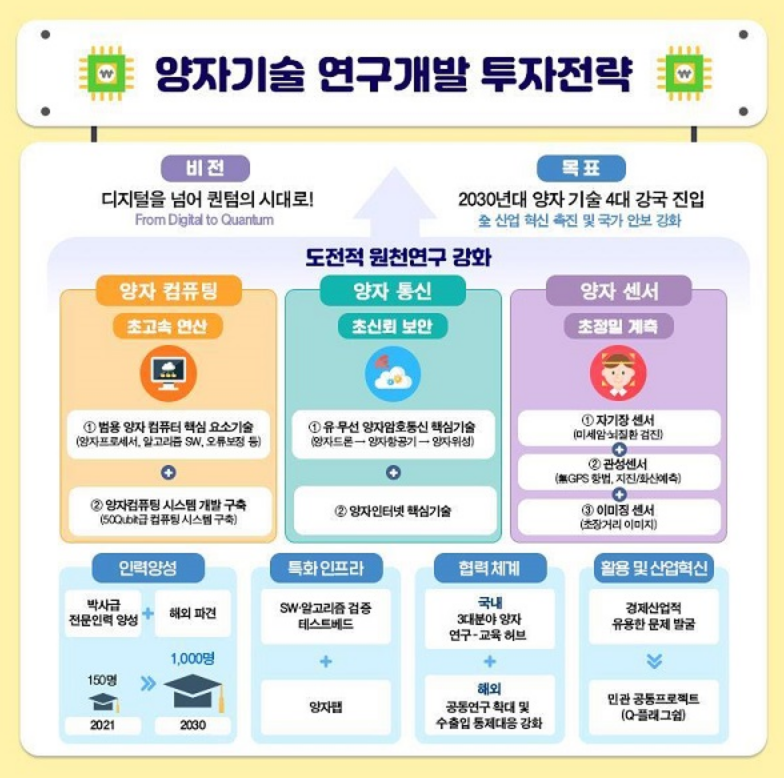 양자기술을 12대 국가 전략 기술로 선정하고 올해 984억을 투입하고 고급 인력 1,000명을 양성한다는 목표를 가지고 있다.