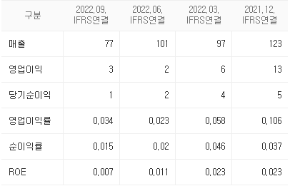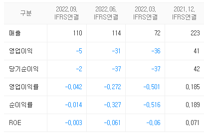 - 주력인 유선 통신장비의 매출 부진이 이어지며 외형이 축소되었고, 판관비 등 비용은 오히려 증가해 대규모 영업손실 및 순손실을 기록하고 있다.