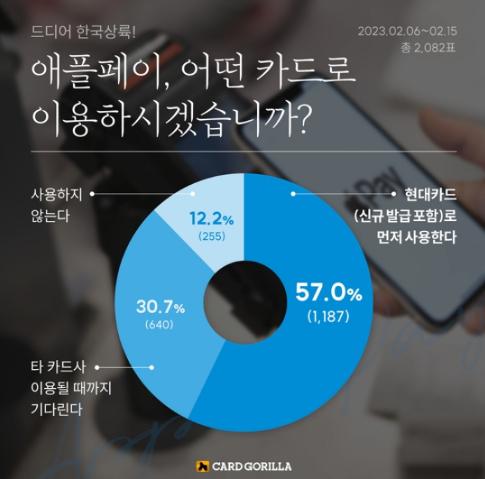 현대카드로 먼저 애플페이를 사용한다는 응답이 57%, 타 카드사 이용 가능할 때까지 기다린다가 30.7%, 사용하지 않는다가 12.2%를 차지했다.