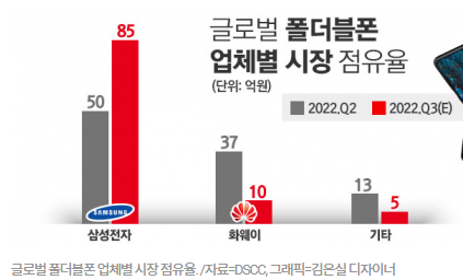 글로벌 폴더블폰 업체별 시장 점유율은 삼성전자가 약 85%를 차지하고 있어 거의 독주 수준이고 출하량이 620만대로 전년 동기 대비 142% 늘어나고 있다.