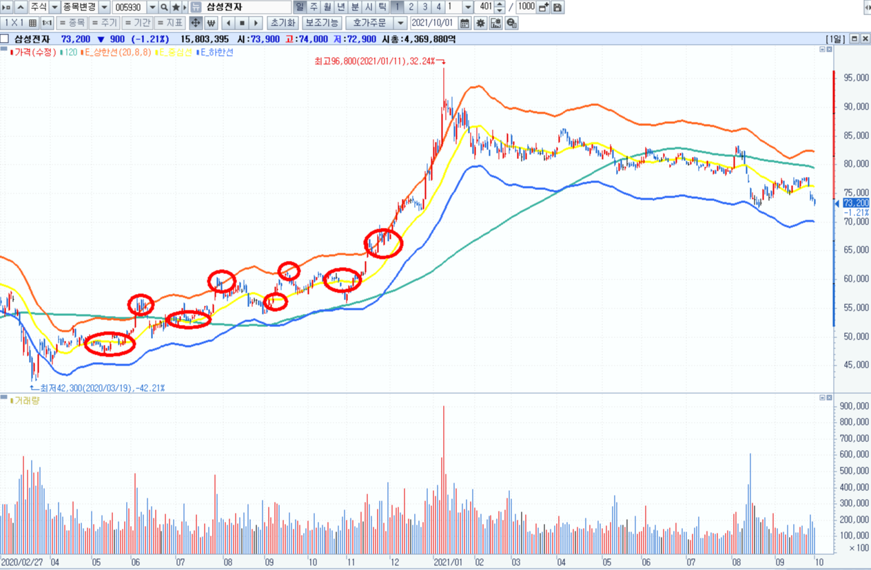 아래의 차트는 삼성전자 차트이고 중심선은 20일, 상한선과 하한선은 8%로 설정했다.