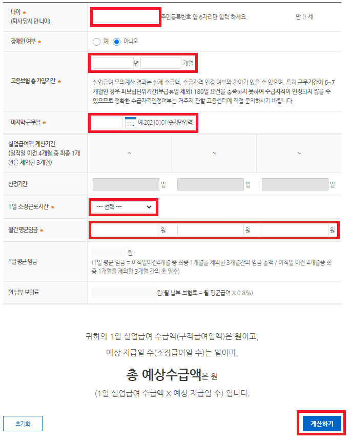 나이, 고용보험 가입기간, 마지막 근무일, 1일 소정근로시간, 월간평균임금 등의 기본 정보를 입력하고 계산하기를 클릭한다.