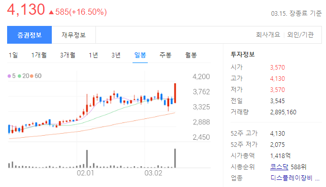 - 1월을 기점으로 꾸준하게 상승해 왔으며, 지금은 60일선 조정을 받고 상승하려는 모습이다.