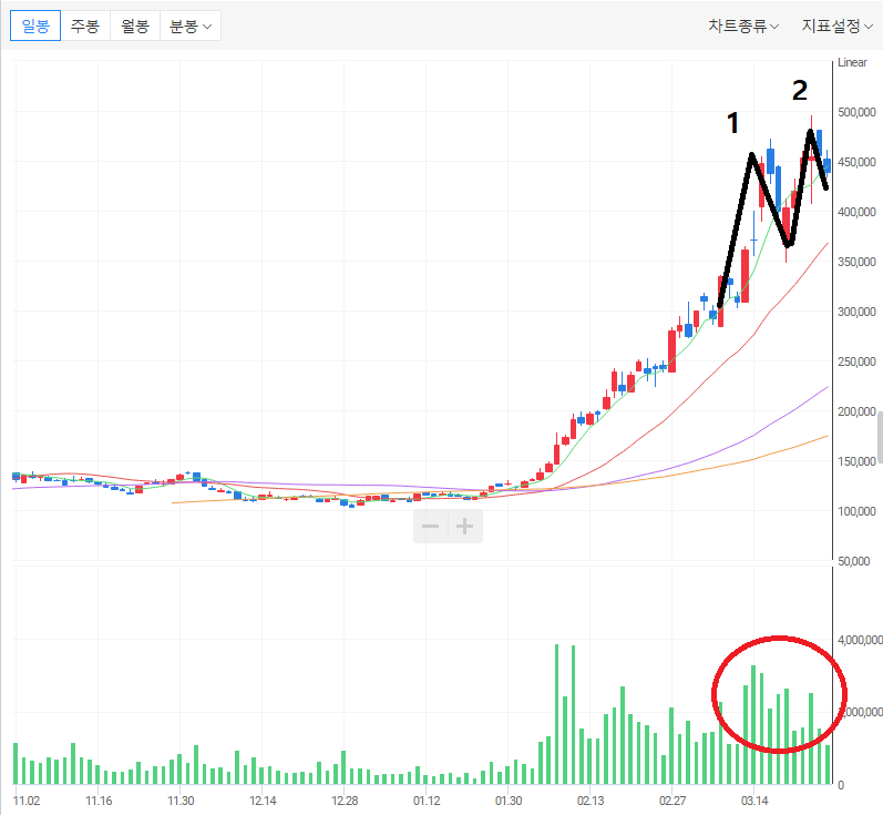 주가가 고점을 갱신하면서 상승하다가 최대 거래량이 발생하게 된다면 세력들이 이탈했을 가능성이 높다.