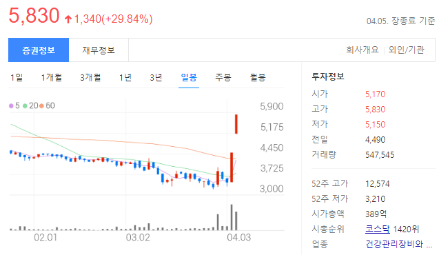 - 횡보하다가 뉴스를 타고 상승추세로 전환되었으며, 지금은 거래량이 증가하면서 급등하고 있다.