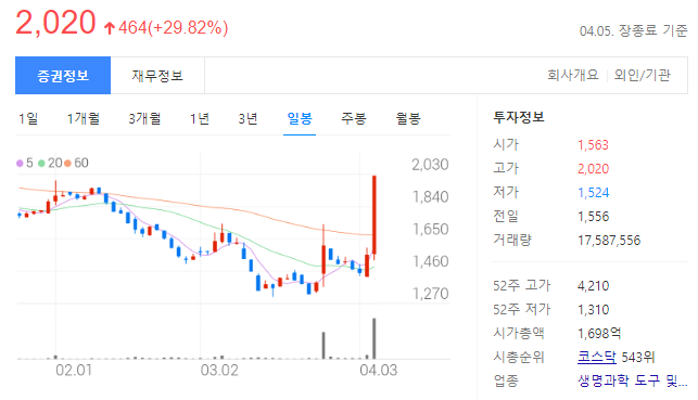 - 분자진단검사를 개발하는 기업으로 기술특례상장으로 코스닥에 상장하였다.
