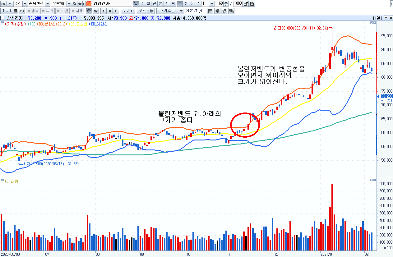 이동평균선의 20일선이 상승으로 올라가기 전에 볼린저밴드는 위, 아래의 좁은 구간에서 수렴하게 되고 변동성이 확대되는 구간에서 볼린저밴드의 위, 아래의 크기가 넓어져서 뚱뚱하게 된다.