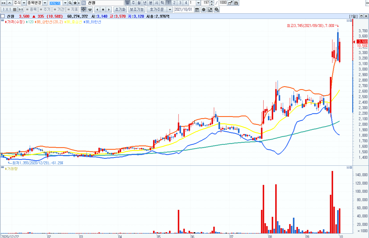 이동평균선의 20일선이 수렴하다가 빨간 동그라미 부분에서 120일선을 뚫고 올라갈 듯하다가 변동성을 주면서 하락하자 이것을 반영한 볼린저밴드가 뚱뚱해진다. 또다시 올라가다 아래로 내려오면서 뚱뚱하게 넓어지려고 한다.