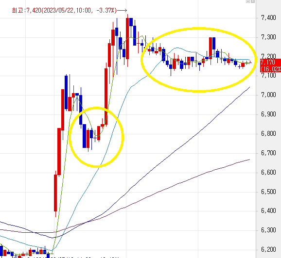 주가의 상승 탄력이 좋다면, 상승 후 단기 고점을 만들고 하락하다가 20일선을 지지하면서 다시 상승할 것이다.