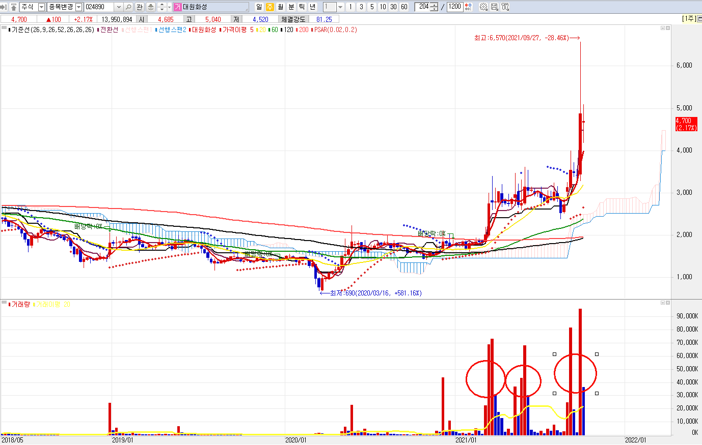 a) 대량의 거래량을 동반하며 상승하였다.