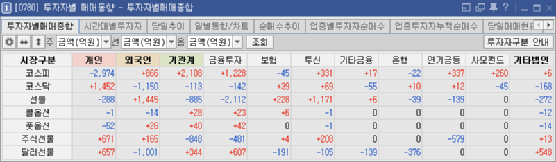 외국인과 기관은 코스피를 매수하고 코스닥을 매도했다.