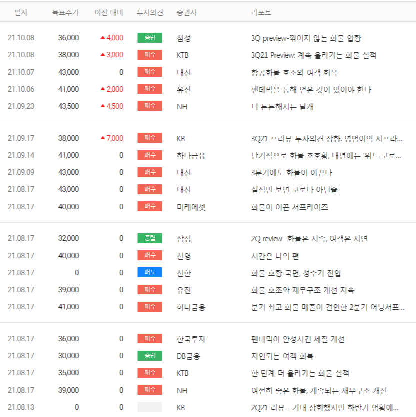 코로나19로 인하여 여행객의 수요는 줄었지만 화물 부분이 호황 국면으로 전환되면서 실적이 개선될 것으로 리포트가 작성되었다.