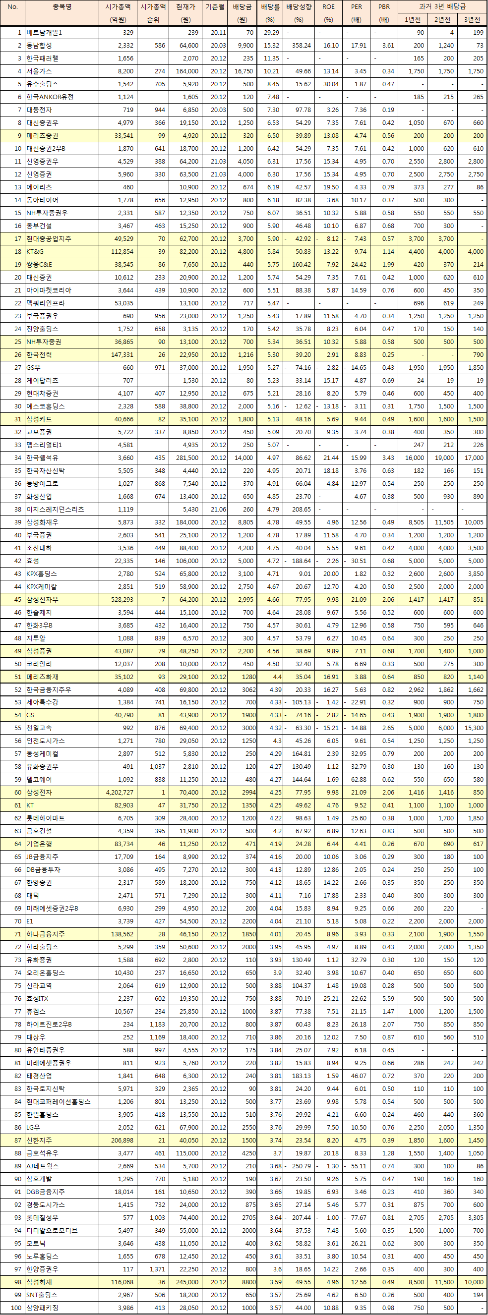 시가총액 100위안에 있는 종목들은 금융, 보험, 증권 업종들이 주로 위치하고 있다. 개별종목들 중에서도 배당률이 높은 알짜기업들이 있다는 것도 알 수 있다.